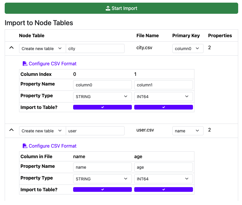 If your CSV file doesn’t contain a header row, Ladybug cannot make assumptions about your table’s column names, or, for node tables, which of the columns is the primary key column. In such cases, you will need to expand the table’s options by clicking on the downward arrow to manually specify the column names.